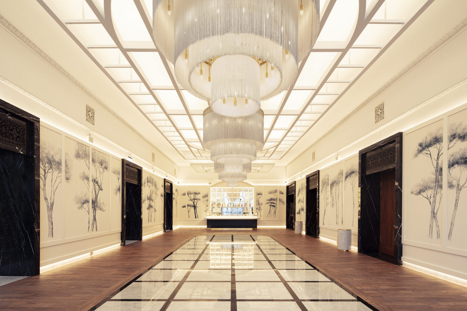 The Khudozhestvenny cinema, one of Moscow’s oldest, opened in the early 19th century and is a cultural heritage landmark. The project involved restoring the cinema’s historic exterior, adding F&B areas, and new screening rooms. Key elements like the main hall, foyer, and decorative details were preserved, including the balcony, vault, frieze, and ceiling cornice. Inspired by cinema’s golden age, the auditorium features red velvet seats, warm-toned rugs, and gold accents. New screening rooms maintain this aesthetic with rich tones, while foyers and restaurant areas reflect the elegance of the 1920s, using marble, delicate patterns, and warm lighting for a sophisticated atmosphere.