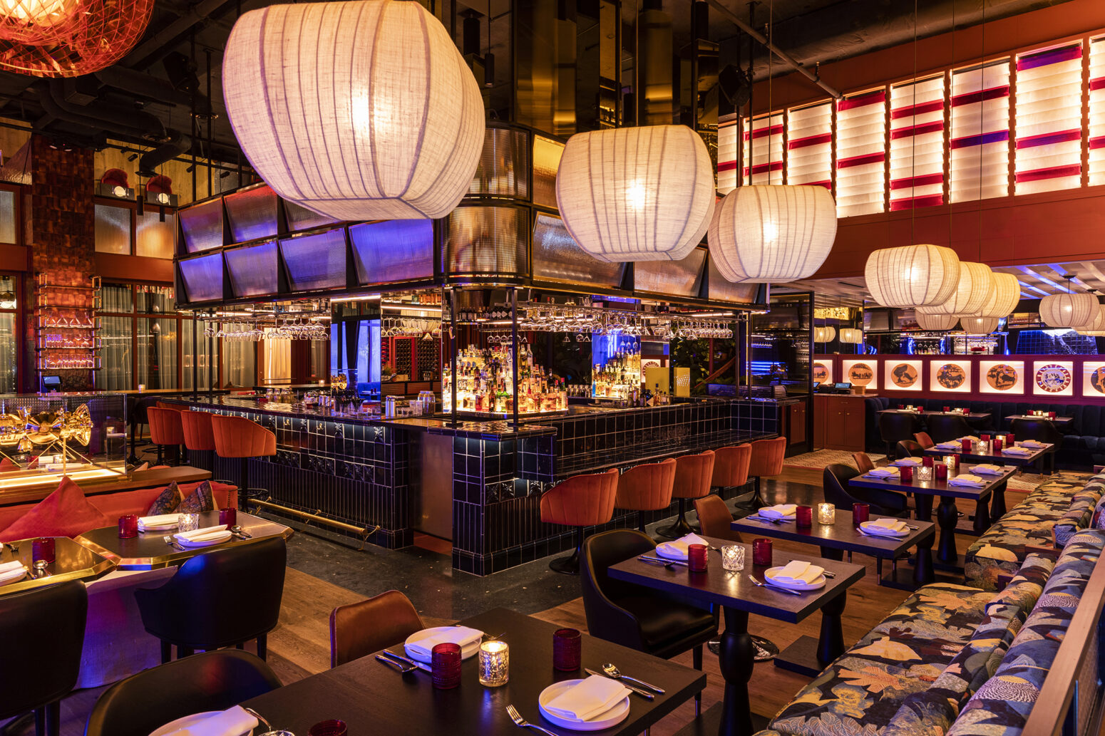 MAD fuses the vibrant Madrid of the 80s with the space culture of Houston and NASA. Its design combines brutalism, colour and dynamism with a palette of terracotta and blue that evokes Madrids’ architecture and the phrase “From Madrid to the sky”. The central bar is the heart of the venue, surrounded by private spaces and an open kitchen. Unique elements, such as brutalist murals, Mars-inspired light fixtures and Cassini satellites, reinforce its identity. The courtyard, with centuries-old olive trees and a surrealist mural, transports you to a universe where gastronomy and design create an immersive and transformative experience.