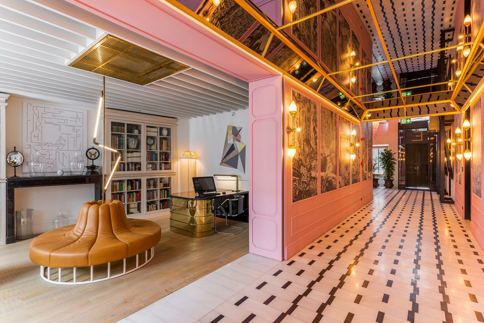 The Hotel is located within various existing and interconnecting buildings. The experience is that of differing spaces merging into one another, reflecting the character and spontaneity of the city. Leather, timber and natural stone are the base materials that combine to create warmth and texture. Carefully curated graphics add an additional and important layer to the project by injecting additional colour and personality. All materials and furniture were sourced in Turkey, ensuring that the project is not only sustainable but also authentic and anchored to the surrounding area.