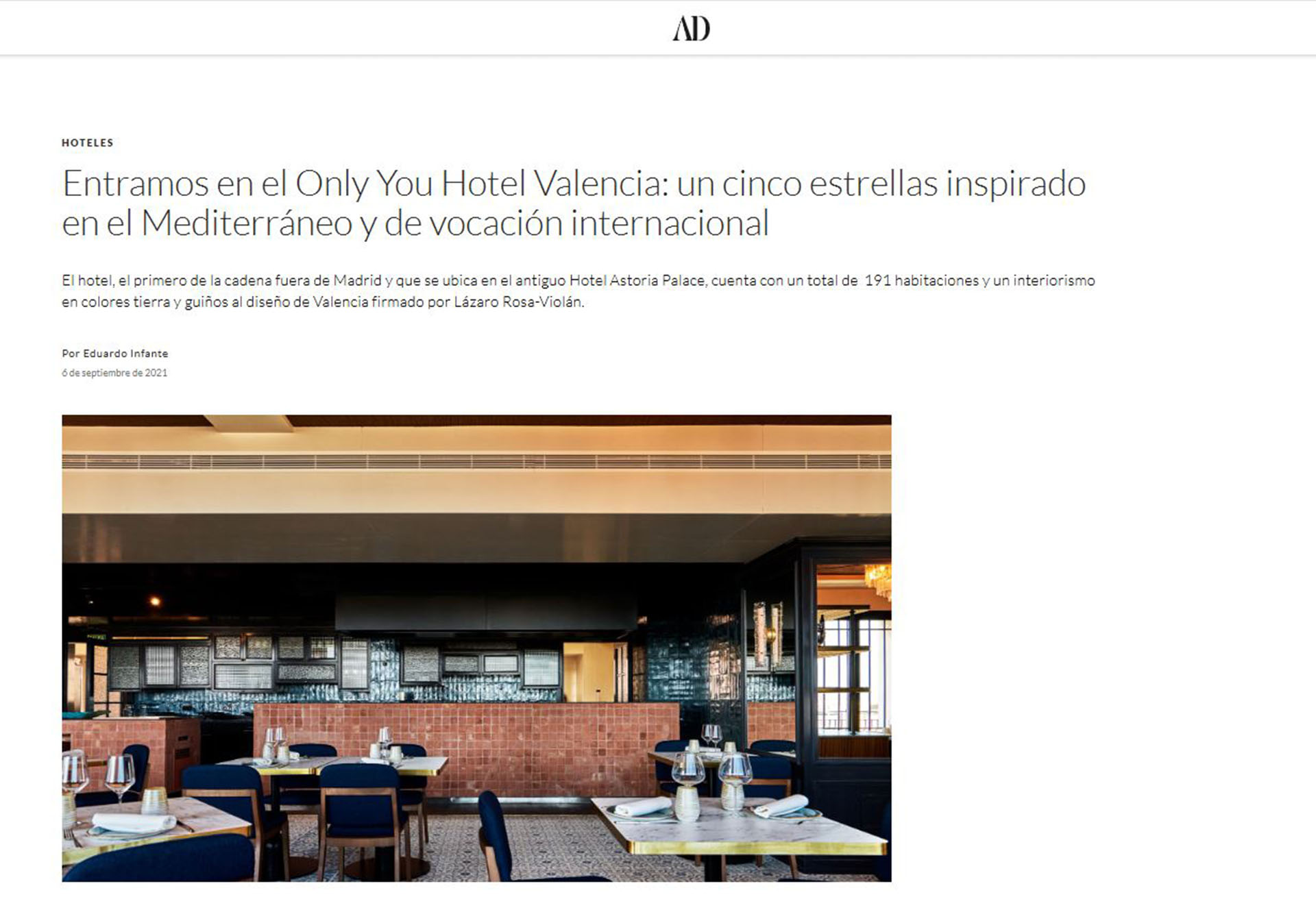 El hotel, el primero de la cadena fuera de Madrid y que se ubica en el antiguo Hotel Astoria Palace, cuenta con un total de 191 habitaciones y un interiorismo en colores tierra y guiños al diseño de Valencia firmado por Lázaro Rosa-Violán.